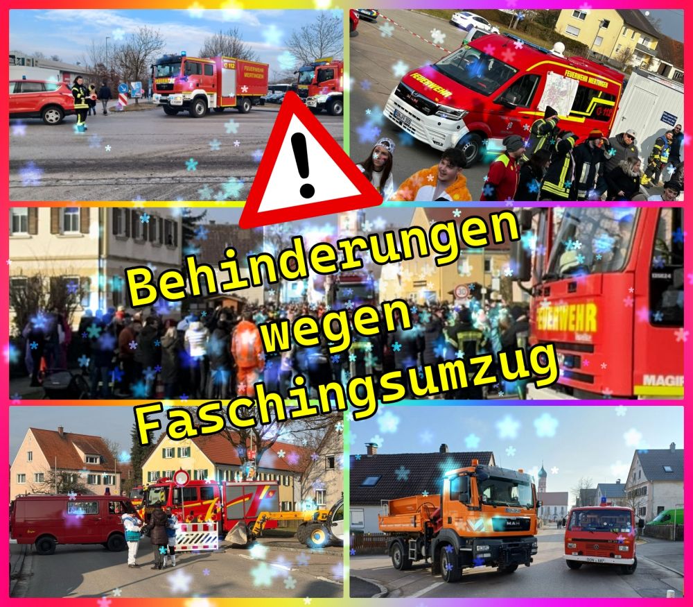 Am Sonntag, 25. Januar 2026 zieht ab 13:31 Uhr der Faschingsumzug mit an die 2500 Teilnehmern durch Mertingen. Aus diesem Grund ist ab Sonntagmittag mit Behinderungen und gesperrten Straßen zu rechnen!