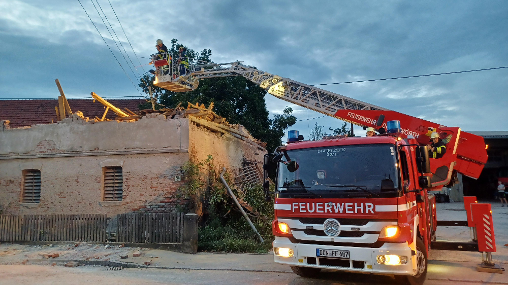 Da sich auf dem Gebäude ein Ständer der Stromversorgung befand, musste dieser aufwendig mit Zuhilfenahme der Drehleiter der Feuerwehr Donauwörth gegen weiteres Abstürzen gesichert werden. Hierfür wurde in dem betroffenen Gebiet vom Energieversorger der Strom für ca. 2 Stunden abgeschaltet.