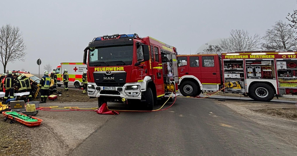 Bei einem schweren Verkehrsunfall auf der Mertinger Umgehungsstraße war ein Großaufgebot an Rettungskräften erforderlich. An der Kreuzung Höhe Biogasanlage sind 2 Fahrzeuge zusammengestoßen. Dabei wurden 3 Personen schwer verletzt. In einem Fahrzeug waren 2 Personen eingeschlossen und konnten nur mit Hilfe von Feuerwehr und Rettungsdienst aus dem Auto gerettet werden. 2 angeforderte Rettungshubschrauber mussten wegen der schlechten Sichtverhältnisse ihren Anflug abbrechen. Die verletzten Personen wurden nach notärztlicher Behandlung in verschiedene Kliniken gefahren.