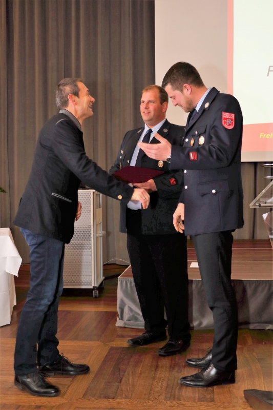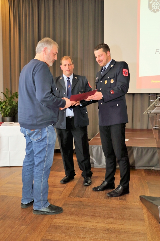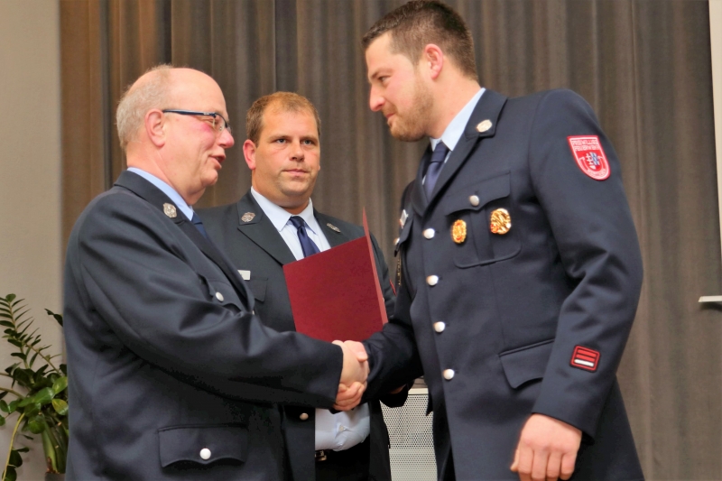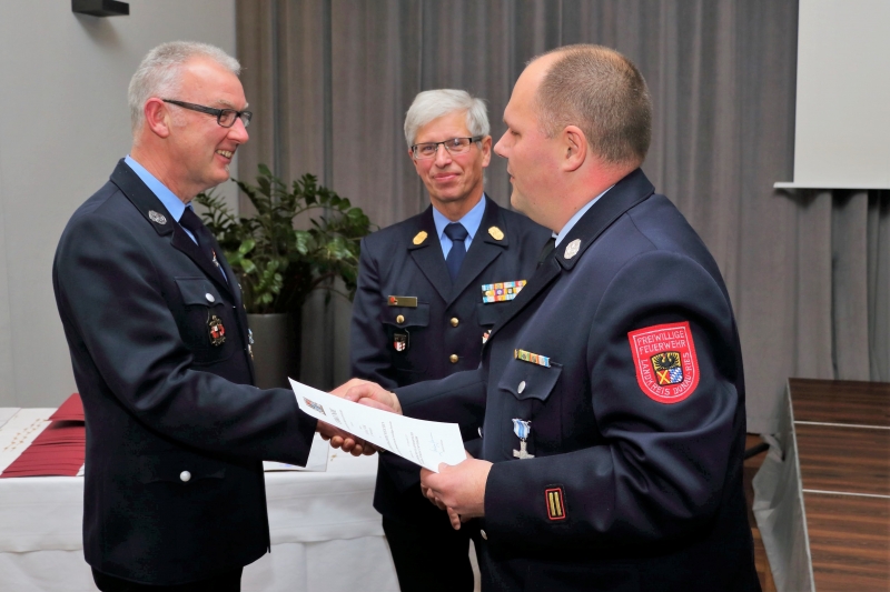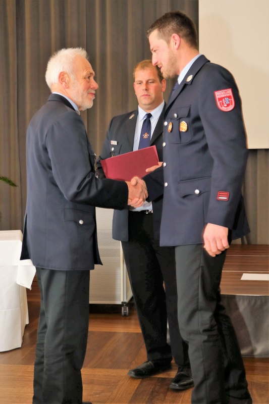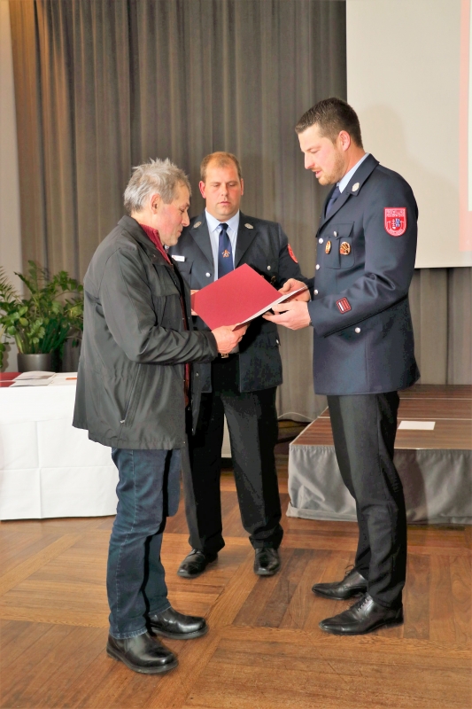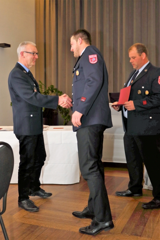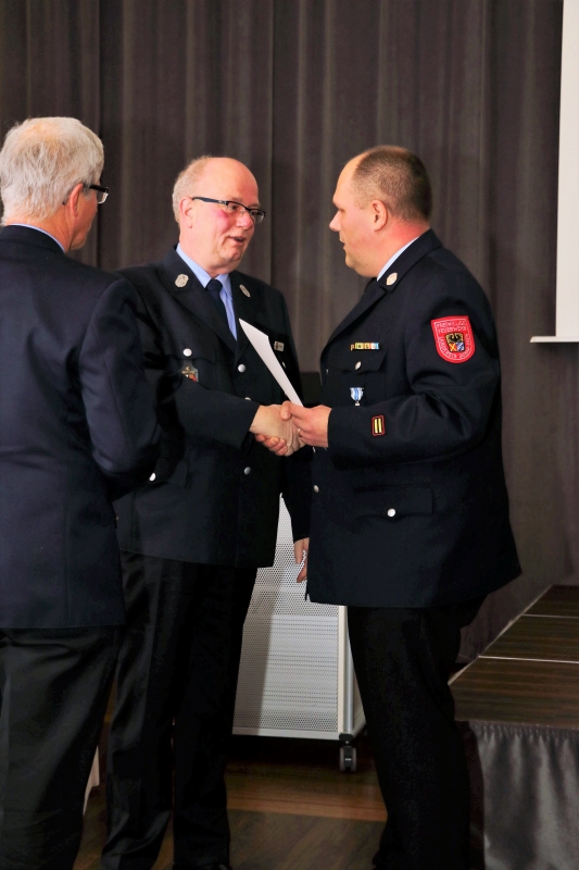 So wurden Alexander Fiebig für 25 Jahre aktiven Dienst mit den Feuerwehr-Ehrenzeichen in Silber und Alfred Völk mit dem Feuerwehr-Ehrenzeichen in Gold für 40 Jahre aktive Dienstzeit ausgezeichnet.