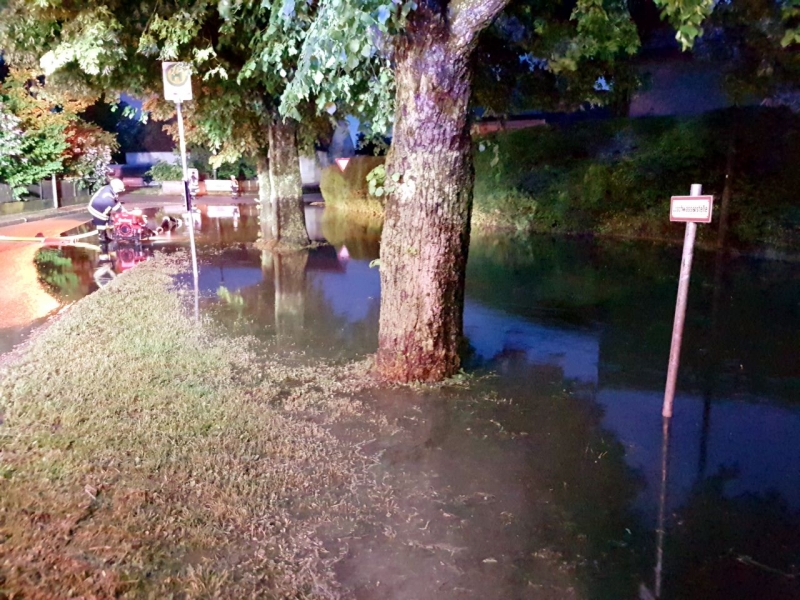 Nach dem am frühen Abend das Unwetter mit massiven Regenfällen loslegte besetzten einige Kameraden bereits das Gerätehaus. Der erste Einsatz lies auch nicht lange auf sich warten. In der Brahmsstraße drohte Wasser in einen Keller zu laufen. Die Feuerwehr konnte dies durch abpumpen des Wassers noch rechtzeitig verhindern. Obwohl zahlreiche Straßen an vielen Stellen unter Wasser standen gab es keine weiteren Hilfsanfragen mehr. Gegen 20:45 Uhr wurde die Mertinger Wehr zur Unterstützung zum Abarbeiten von Unwettereinsätzen mit einem Fahrzeug nach Eggelstetten alarmiert.