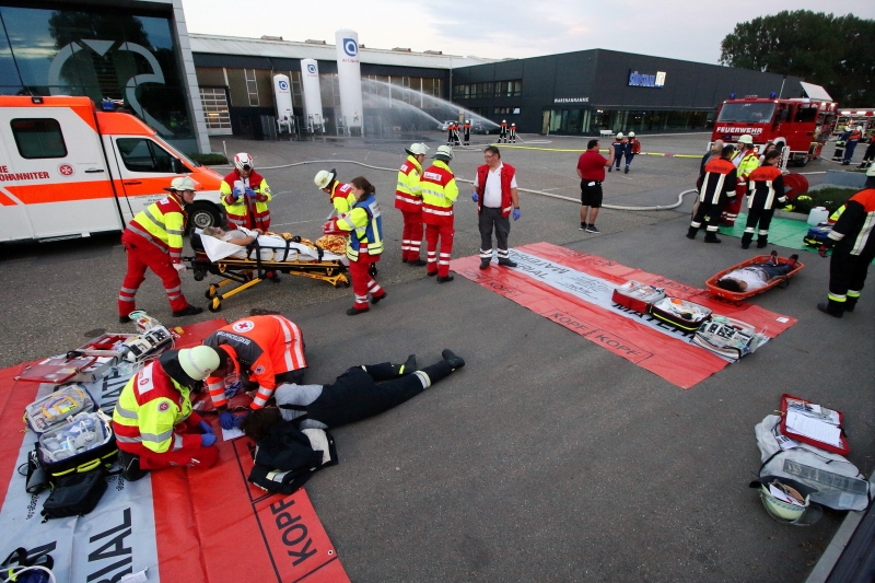 Verpuffung bei der Fa. Südstahl - 2 Hallen betroffen - mehrere Personen verletzt - weitere Lage unklar. Dies war das Einsatzstichwort zu einer Großübung im Rahmen der Feuerwehraktionswoche in Mertingen.
