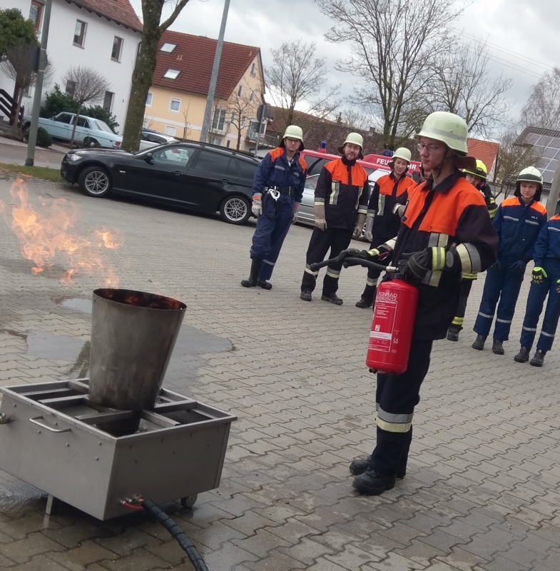 Die Bilder entstanden nach der Unterrichteinheit Kleinlöschgeräte. Hier wird der richtige Umgang mit einem Feuerlöscher geübt.