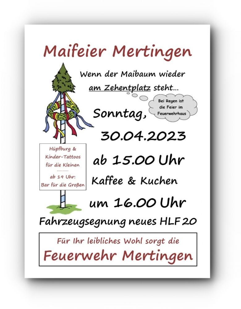 Zu unserer traditionellen Maifeier dürfen wir euch ganz herzlich einladen. Der Maibaum wird am Samstag 29.04. um 16 Uhr am Zehentplatz aufgestellt. Die eigentliche Maifeier startet dann am Sonntag 30.04. ab 15 Uhr bei Kaffee und selbstgebackenen Kuchen.