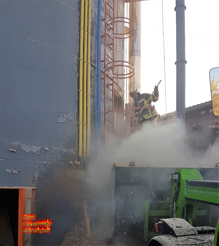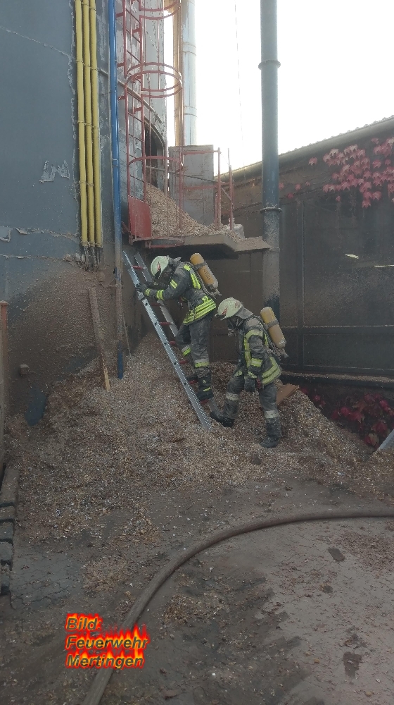 In einem Holzspänesilo einer Mertinger Schreinerei kam es vermutlich durch einen technischen Defekt zu einem Schwelbrand. Da sich der Brand schon weit in das Innere des Silos vorgefressen hatte musste der gesamte Inhalt, ca. 70 Kubikmeter, per Hand aus dem Silo geräumt werden.