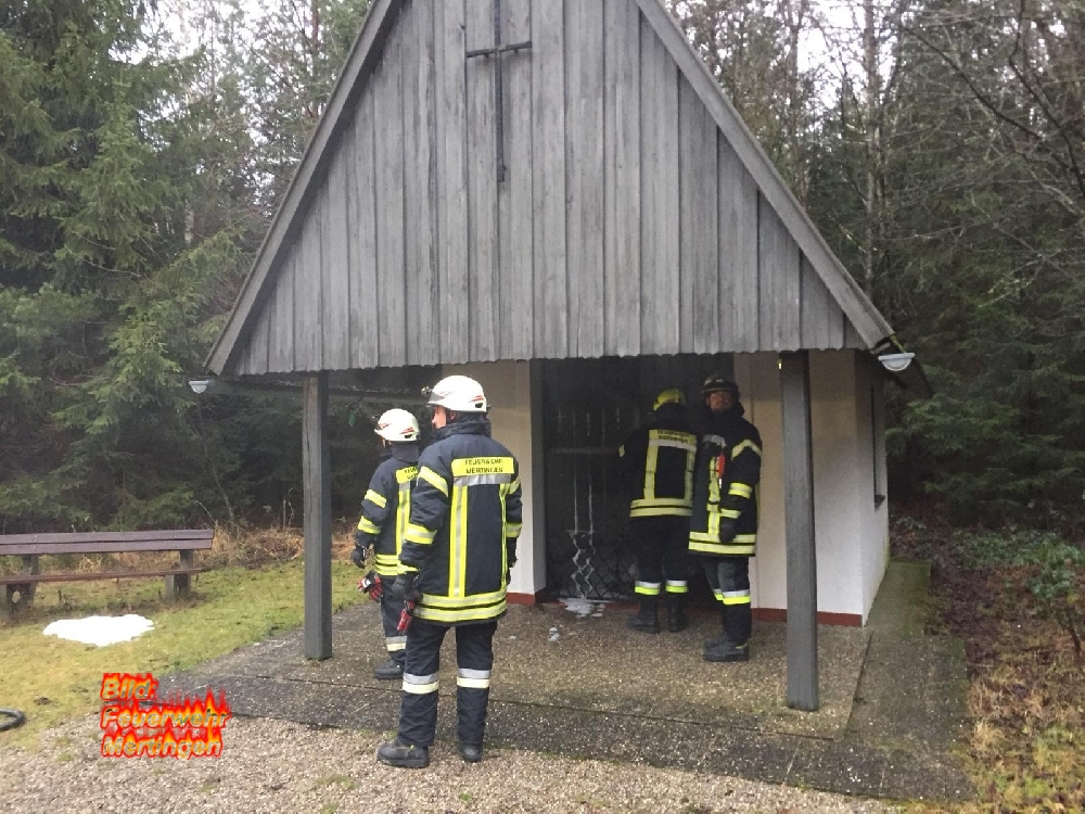 Ein großes Adventsgesteck ist in der Mertinger Waldkapelle in Brand geraten. Das Feuer konnte von der alarmierten Feuerwehr noch rechtzeitig abgelöscht werden bevor es auf einen danebenstehenden Weihnachtsbaum übergriff.