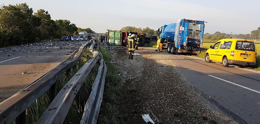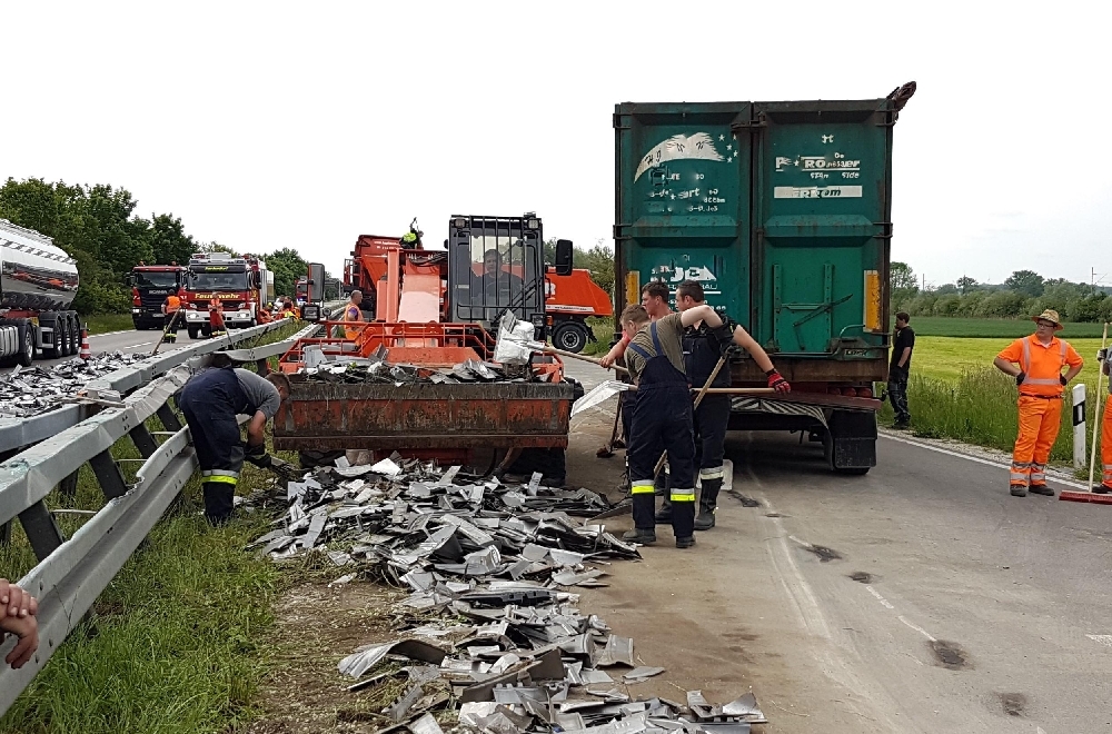 Aufgrund eines Reifenplatzers verlor ein LKW-Fahrer auf der Bundesstraße 2 kurz nach Mertingen die Kontrolle über sein Fahrzeug. Das Gespann kippte um und die Ladung verteilte sich auf alle 4 Fahrstreifen. Der Sattelzug kam quer über die gesamte Fahrbahn zum Liegen.