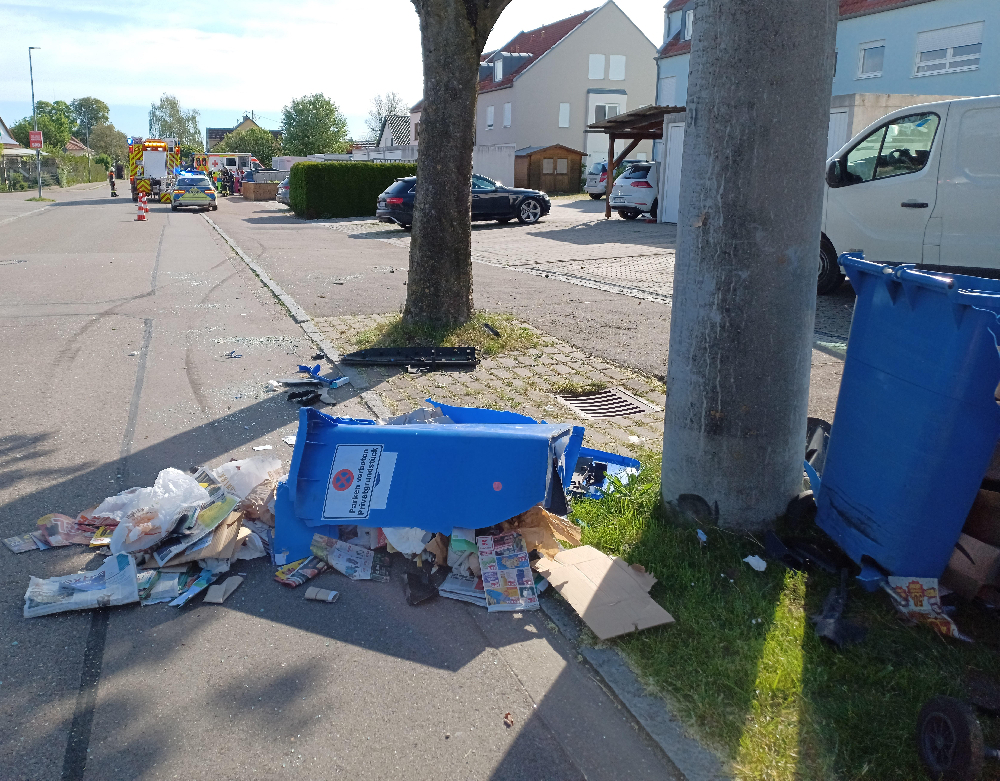 Ein PKW ist in der Bahnhofstraße von der Fahrbahn abgekommen, hat mehrere Papiertonnen umgefahren und einen Betonmasten touchiert. Dabei wurden 2 Fahrzeuginsassen verletzt.